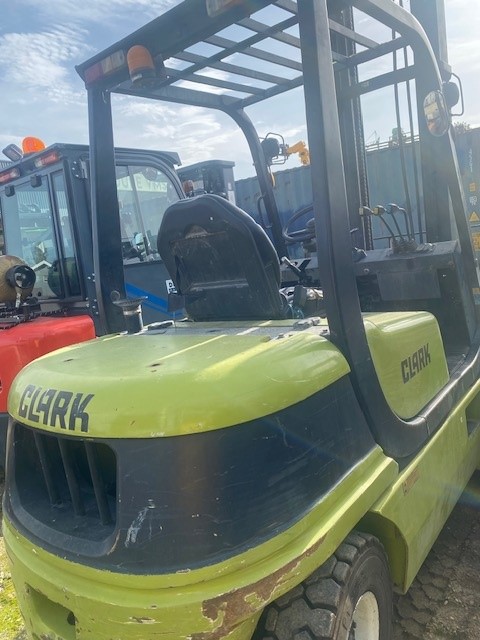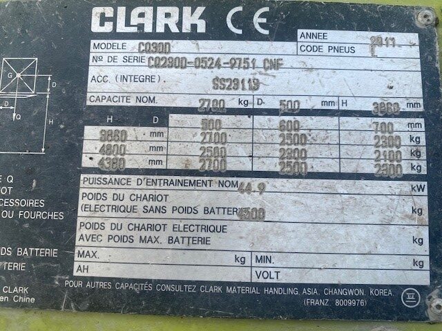 CHARIOT ELEVATEUR DIESEL CQ30D Année : 2011 Heures : 5650h environs Marque CLARK Moteur Diesel Année 2011 Mat triplex 4300 MM Fourche 1200mm TDL